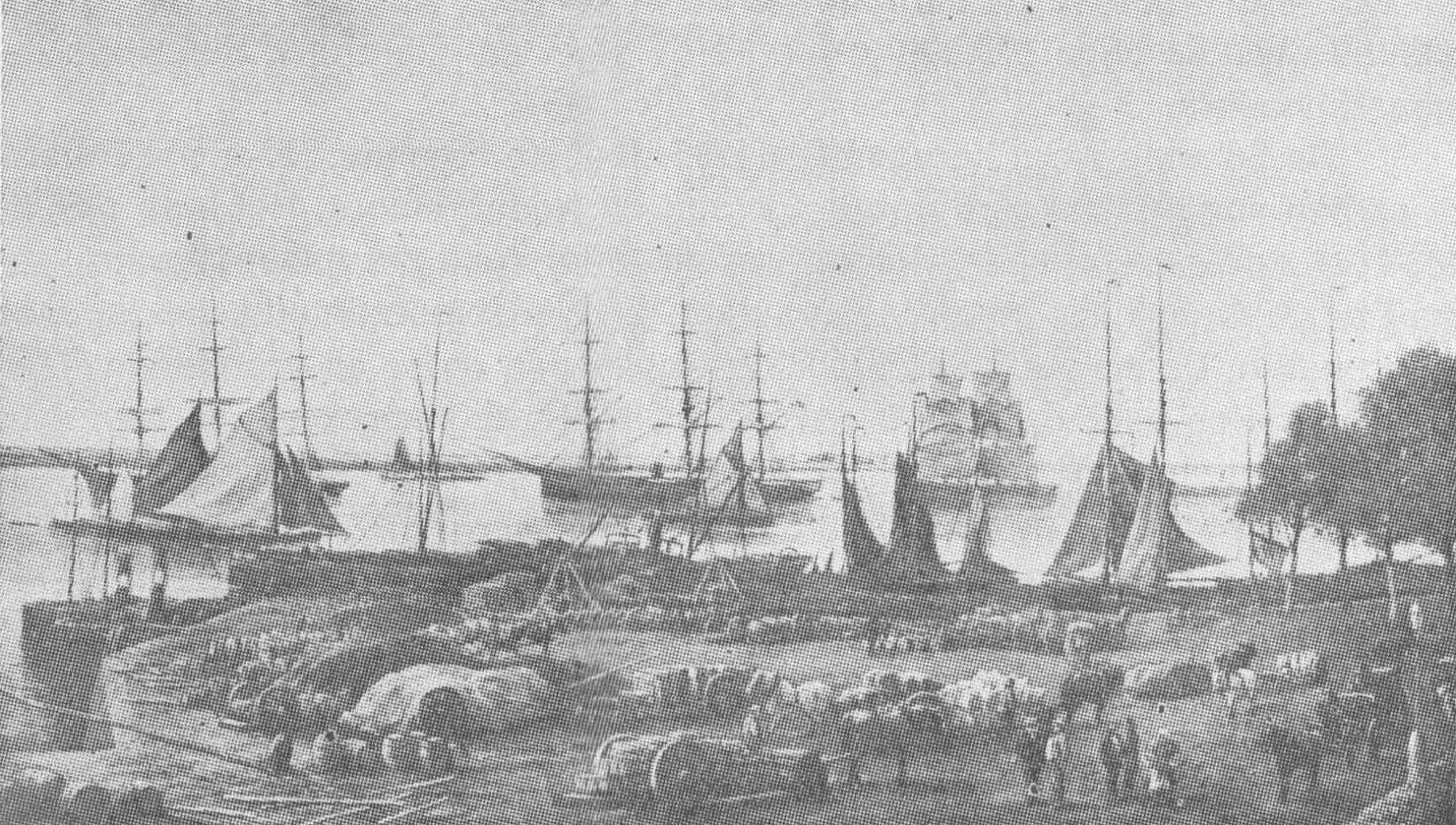 Zicht op de Scheldebocht vanop de Rijnkaai te Antwerpen in 1880. De vaartuigen vooraan zijn Antwerpse sloepen.