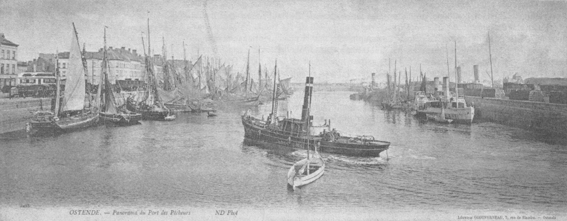 Het Montgomerydok te Oostende vóór 1900. Centraal een stoomsleper en links, tegen de kaai, enkele platgat-sloepen. Het opvallend laag huisje bij de vismarkt werd “Preekstoel” genoemd en de bewoners behoorden tot de vissersfamilie Geselle.