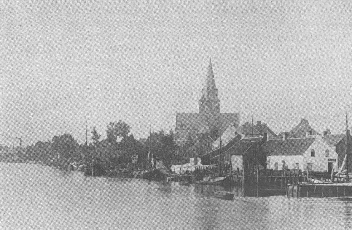 De haven van Burcht in 1905 met centraal de werf van Maes die later net voorbij de kerk geïnstalleerd werd. Let op de hoogaars en de hengst (Zeeuwse platboomde zeilvissloepen).