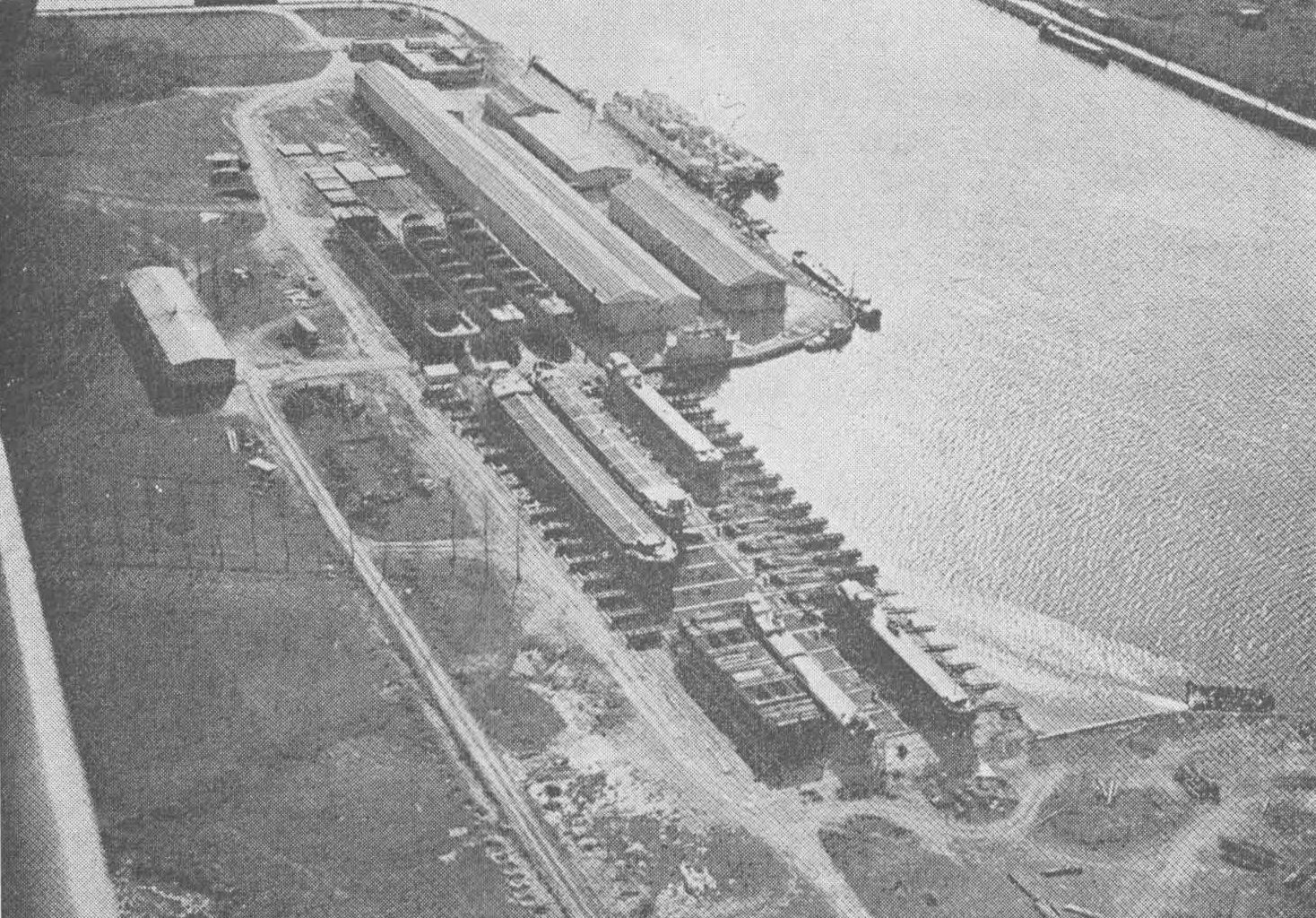 Luchtfoto van de scheepswerf van Langerbrugge N.V., Gent-Rodenhuize (Kanaal Gent-Terneuzen).