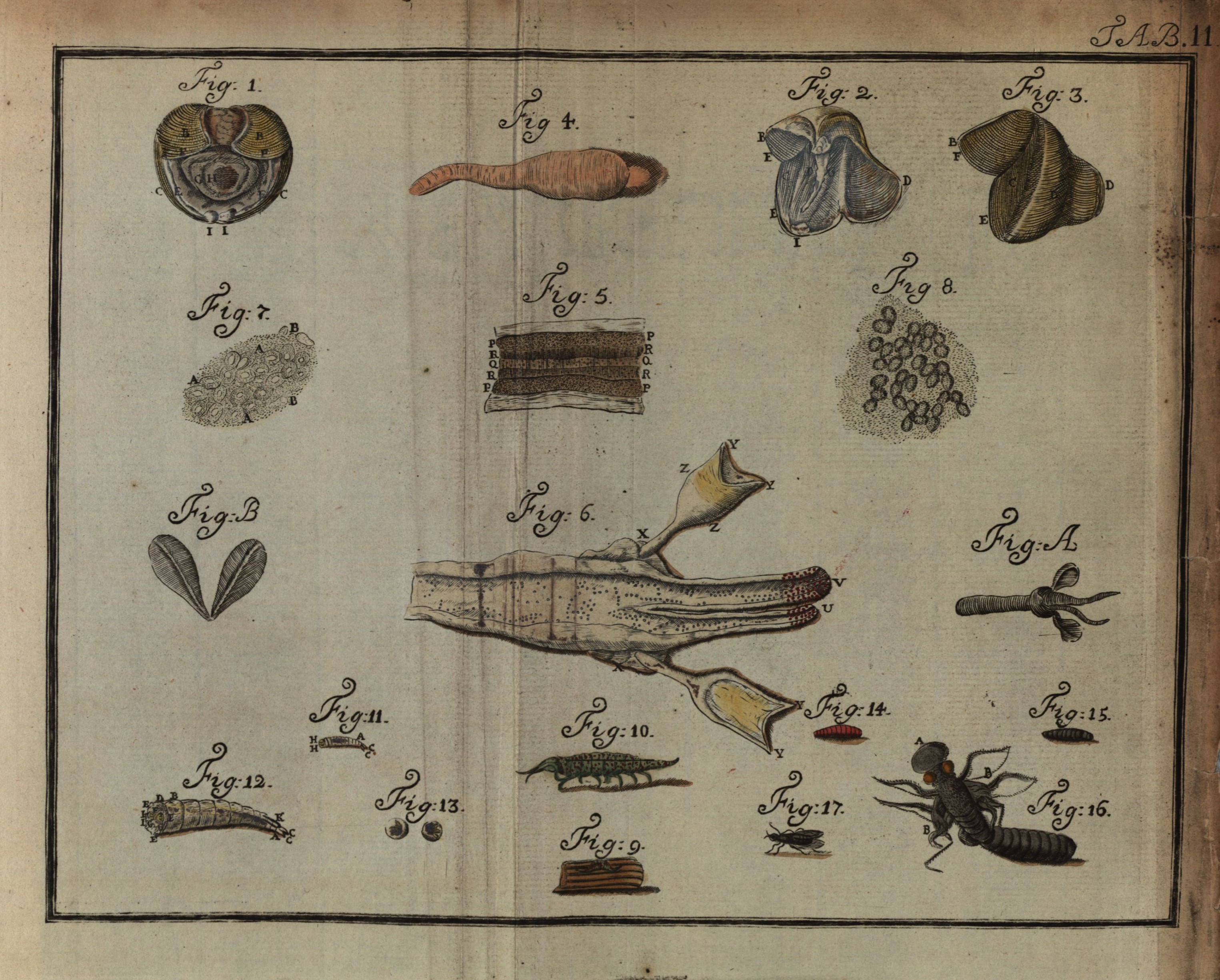). 11 – 17. Larve, pop en volwassen exemplaar van een vlieg. A. Achterzijde van een paalworm (