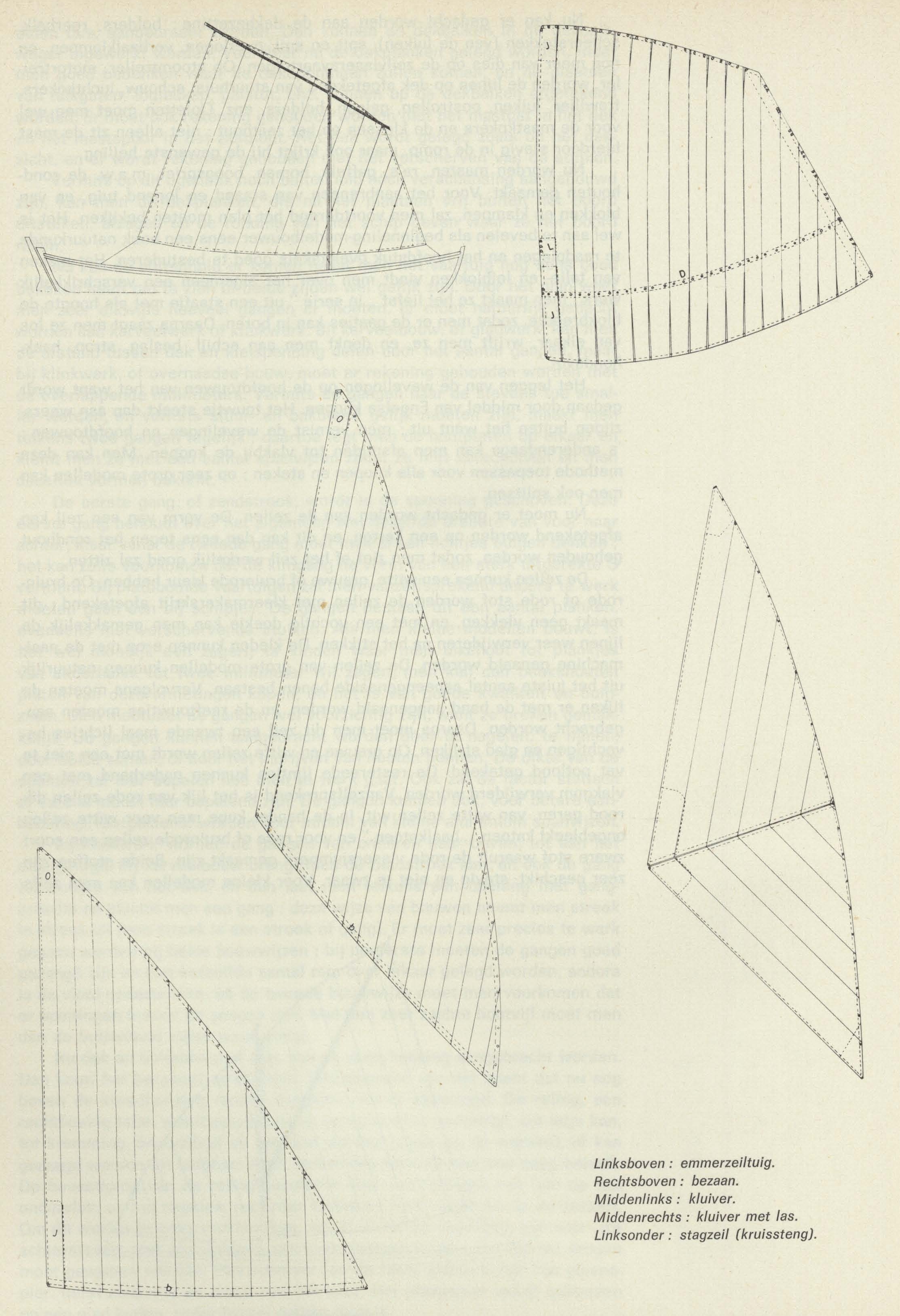 Linksboven: emmerzeiltuig. Rechtsboven: bezaan. Middenlinks: kluiver. Middenrechts: kluiver met las. Linksonder: stagzeil (kruissteng).