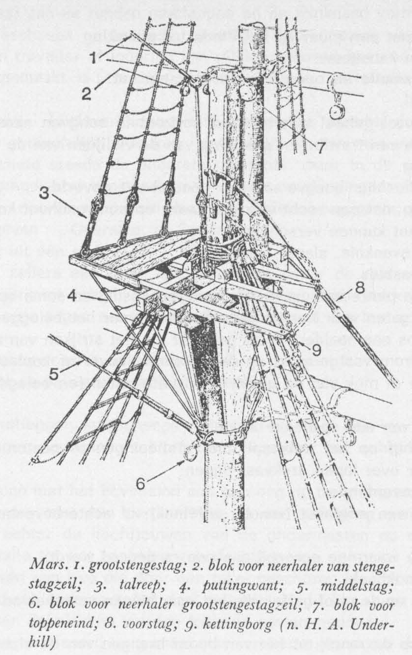 Mars. 1. Grootstengestag. 2. Blok voor neerhaler van stengestagzeil. 3. Talreep. 4. Puttingwant. 5. Middelstag. 6. Blok voor neerhaler grootstengestagzeil. 7. Blok voor toppeneind. 8. Voorstag. 9. Kettingborg (n. H. A. Underhill).